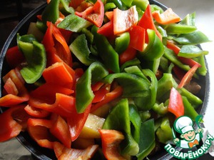 В последнюю очередь кладем перцы. Тушим под крышкой минуты 3-4. Выключаем огонь, оставляем еще минут на 5-10.
