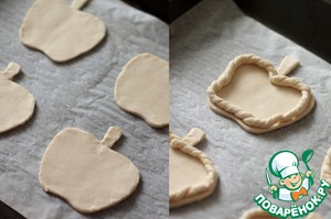 Из остатков теста нарезаем полоски, скручиваем в жгутики между собой и укладываем их по контуру яблочка.