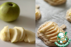 Яблоко почистим и нарежем на дольки. Укладывайте яблочки так, чтобы они чуть поднимались над тестом.