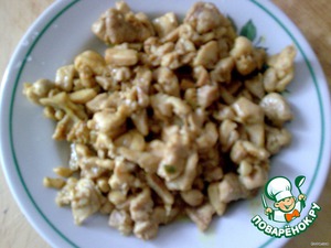 Мясо с окорочка мелко порезать обжарить, посолить, поперчить и посыпать приправой для курицы.