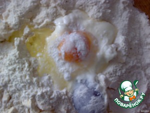 Маргарин порубить с мукой, добавить половину сметаны, 1 яйцо, сахар, соль, еще муки, сколько возмет тесто.