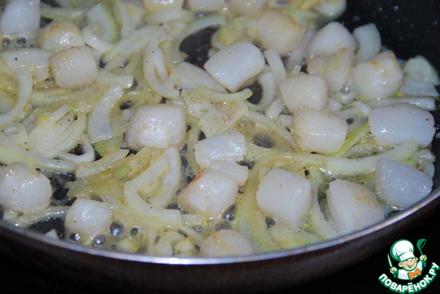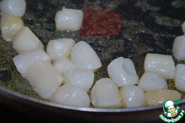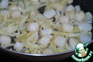 Добавляем лук к гребешку и обжариваем ещё 1 минуту.