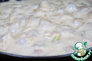 Добавляем соль по вкусу, свежемолотый чёрный перец, белое сухое вино, сливки и натёртый твёрдый сыр (у меня любимый пармезан), всё перемешиваем, накрываем крышкой и тушим 2 минуты.