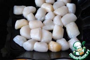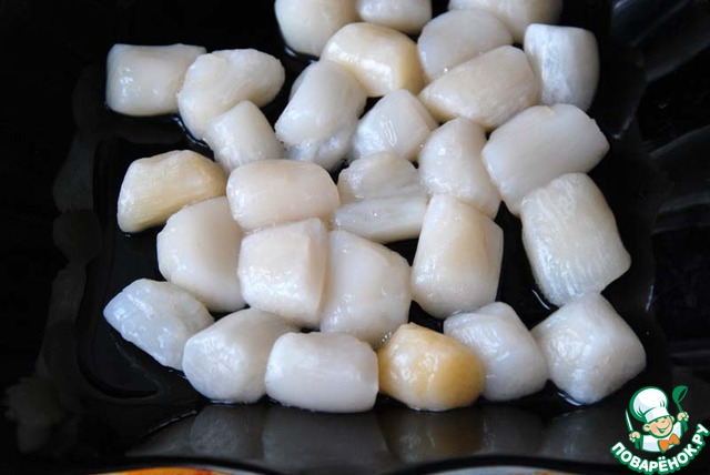Одновременно достаём замороженный гребешок и оставляем размораживаться, он должен разморозиться самостоятельно.