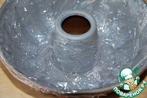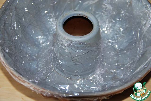 Берём форму с дыркой посредине, выкладываем внутри пищевую плёнку.