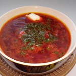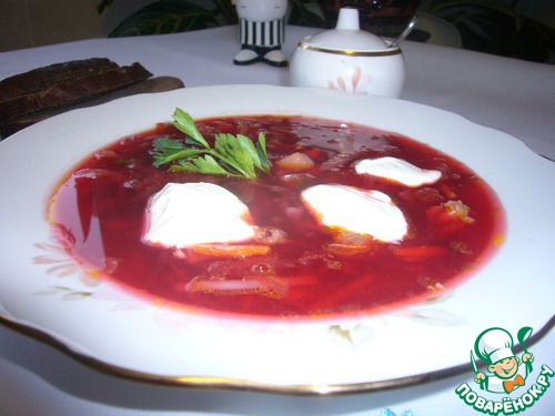 Клянусь, придумка не моя, именно борщ, приготовленный по этому рецепту, был одним из любимых блюд известного актера. Подавался борщ, а, может быть, подается до сих пор в одном из "русских" ресторанов в Америке. Я попыталась воспроизвести этот рецепт как можно ближе к оригиналу. Испытания прошли на муже и прошли успешно (просил добавки и чеснока). Рецепт из книги "Рецепты кремлевского шеф-повара".