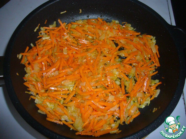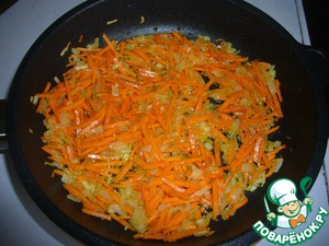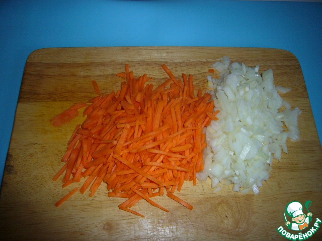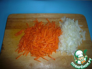 • Мелко нарезать лук, нашинковать соломкой морковь.