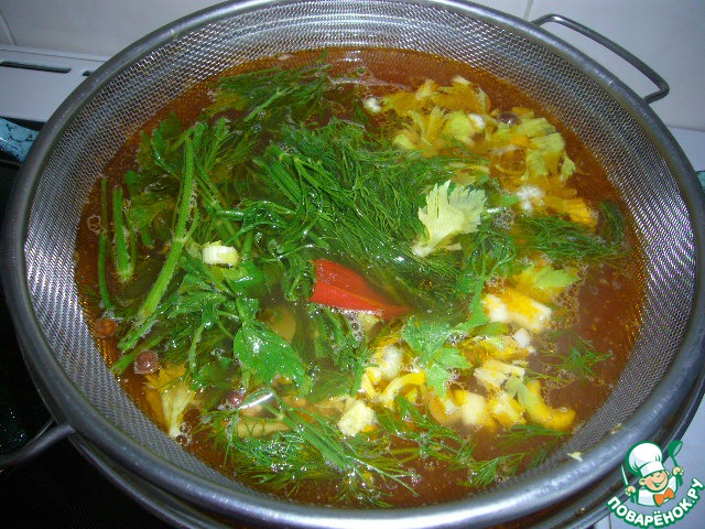 • В сито выложить горошины душистого перца, пучки: петрушки (1), укропа и сельдерея (т. к. зелень сельдерея купить в это время года проблематично, я порезала стебель и листья на нем), кусочек жгучего перца.