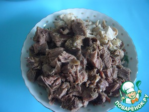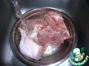 Мясо промыть, оставить в проточной воде на 15 минут. Выложить в кастрюлю и поставить варить. Воды в кастрюле должно быть в 3-4 раза больше, чем мяса.