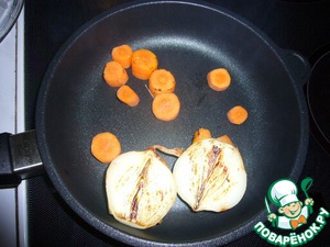 Неочищенную головку лука разрезать пополам, морковь нарезать крупно. Разогреть сковороду и запечь морковь и лук на раскаленной сковороде без масла. За 30 минут до окончания варки в бульон положить перец горошком, лавровый лист, подпеченный лук и морковь.