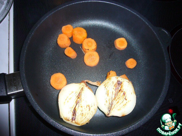 • Неочищенную головку лука разрезать пополам, морковь нарезать крупно. Разогреть сковороду и запечь морковь и лук на раскаленной сковороде без масла. За 30 минут до окончания варки в бульон положить перец горошком, лавровый лист, подпеченный лук и морковь.