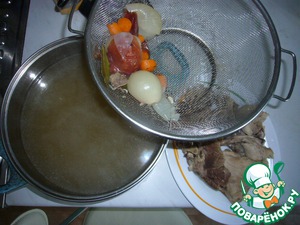 Через 2 часа, когда мясо будет готово, специи, лук и морковь удалить, мясо выложить, а бульон профильтровать, и поставить вновь на огонь..