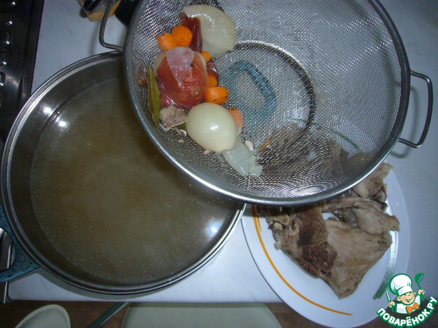 • Через 2 часа, когда мясо будет готово, специи, лук и морковь удалить, мясо выложить, а бульон профильтровать, и поставить вновь на огонь..