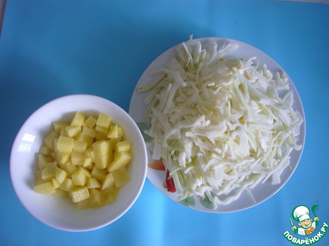 • Нарезать капусту соломкой, картофель - кубиками и отправить в бульон.