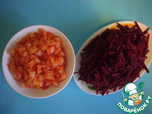 Свеклу нарезать мелкой соломкой, помидоры мелкими кусочками, предварительно обдав кипятком и сняв кожицу.