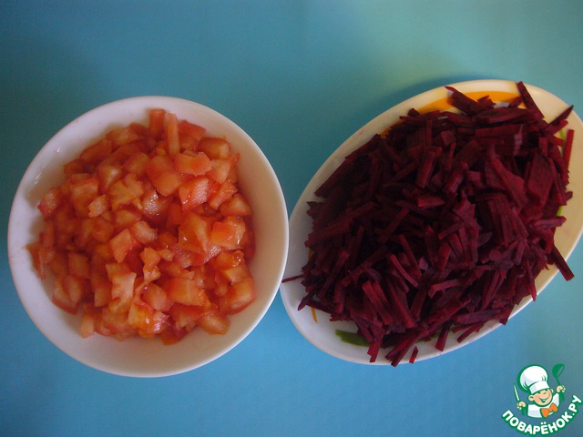 • Свеклу нарезать мелкой соломкой, помидоры мелкими кусочками, предварительно обдав кипятком и сняв кожицу.