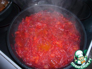 Приготовить пассеровку из свеклы с помидорами, для этого свеклу обжарить в течение 10 минут на оливковом масле. Влить 4 столовых ложки бульона, добавить соль, сахар, яблочный уксус (количество этих ингредиентов не меняла) и тушить 20 минут. За 10 минут до окончания добавить помидоры.