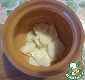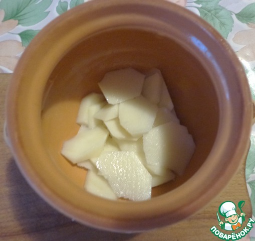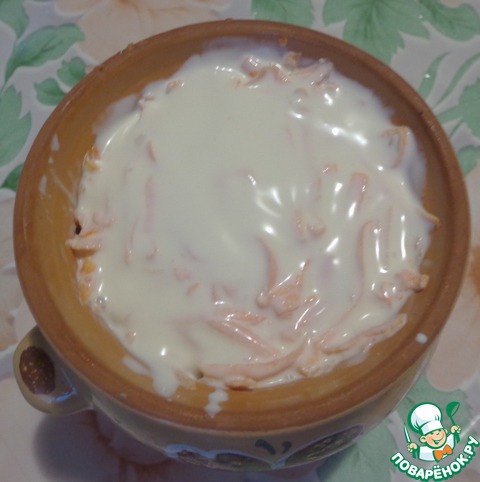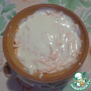 Выкладываем слой картофеля в горшочек, солим по вкусу, покрываем слоем сметаны.