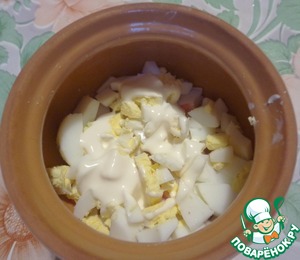 Нарезать кубиками яйцо, выкладываем в горшочек и покрываем сметаной.