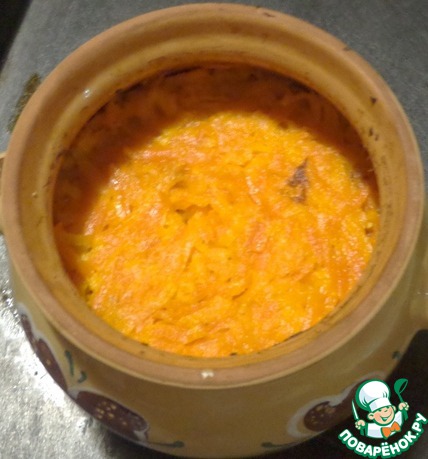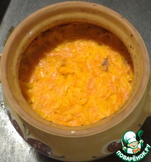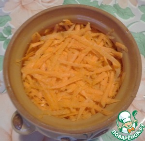 Морковь натереть на крупной терке. Посолить и поперчить.