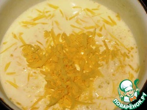 Сначала приготовим соус. Пока мы будем готовить креветки, он как раз остынет. Сливки немного нагреем в кастрюле и добавим тёртый сыр.