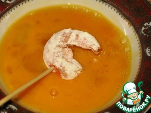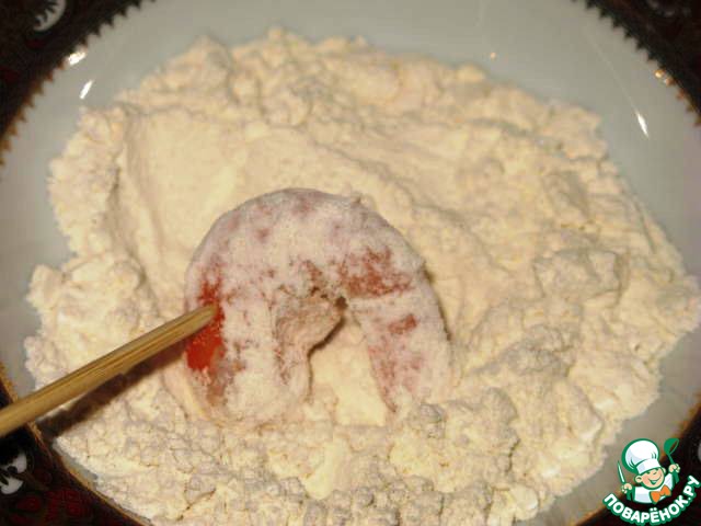 Сначала каждую креветку обваливаем в муке. Я для удобства взяла деревянную шпажку.