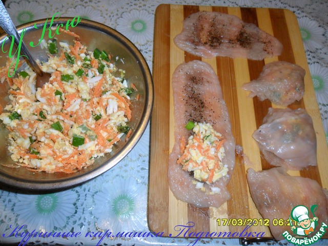 Режем филешки на пластинки, на сколько выйдет, у меня из 2-х получилось 12 пластин. Хорошо отбиваем, дырочки если получились накрыть кусочками образовавшимися при отбивании и нарезке. Слегка присаливаем и перчим, кладем на одну сторону начинку. У меня был: плавленый сырок, яйцо вареное, морковь сырая - все трем на терке, зелень, заправляем майонезом, перчим, солим, чеснок, и взбитым яичком. Накрываем второй стороной и прижимаем по краям, опускаем в кляр: 1 яйцо + 1 ст. л. муки + 1 ст. л. воды + щепотка соды, сколько нужно, считаем сами. Обжариваем в масле.