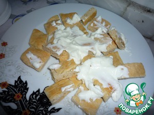 Готовую лепешку разрезать на небольшие куски, разложить по тарелкам, сверху положить пару ложек йогурта.