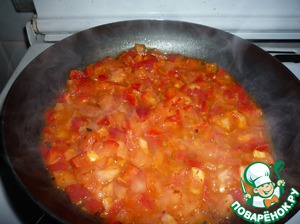 Помидоры (без кожуры) и сладкий перец мелко нарезать, потушить на отдельной сковороде до мягкости минут 8-10, посолить.