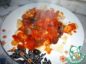В тарелку поверх лепешки с йогуртом выложить слоями мясо и овощи, полить соусом и подать к столу.