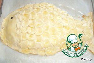 Из оставшегося теста вырезать рюмкой кругляшки ("чешую"), и закрыть ими оставшуюся часть "рыбы".