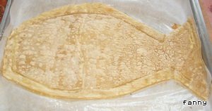 Духовку разогреть до 190°. Примерно из половины (или около 2/3) теста раскатать тоненький лист и вырезать из него силуэт большой рыбы (можно использовать изготовленную из бумаги выкройку).