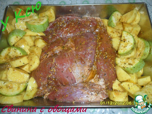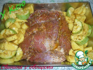 На следующий день картофель и кабачки нарезаем на небольшие дольки, отправляем к свинине и хорошо перемешиваем (можно вынуть мясо и овощи перемешать в соусе, где было мясо).