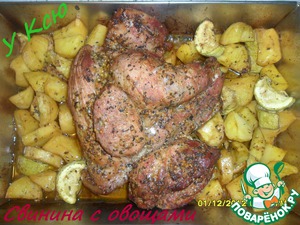В данном случае, свинина, у меня была рулька 2,4 кг. Я из нее вырезала кость (после использовала для бульона), затем развернула мясо с рульки как книжку, и уложила одним куском шкуркой вниз.