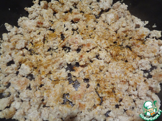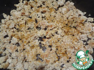 • Размораживаем и обжариваем фарш с большим количеством смеси перцев и небольшим - соли.