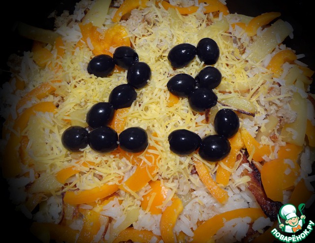 • В глубокой сковороде соединяем ингредиенты, обжариваем несколько минут, помешивая. Блюдо готово, можно подавать на стол, предварительно посыпав сыром и украсив маслинами. Приятного аппетита!
