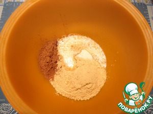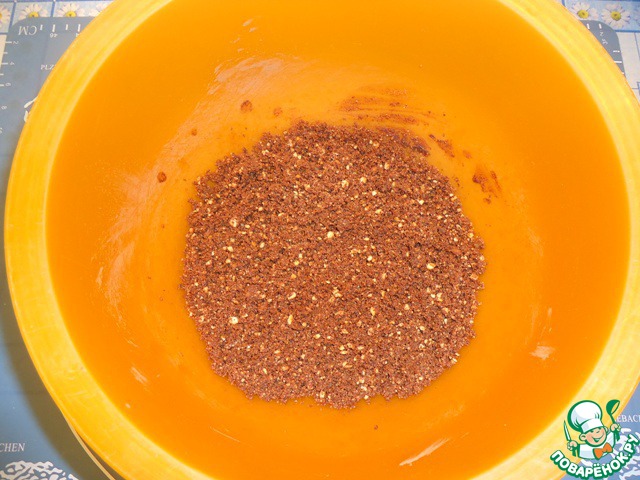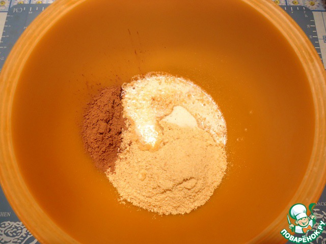 К крошке добавляем сахарную пудру, какао и растопленное сливочное масло.