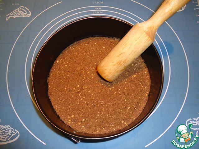 Выкладываем получившуюся шоколадную крошку в форму, с помощью толкушки выравниваем и придавливаем поверхность.