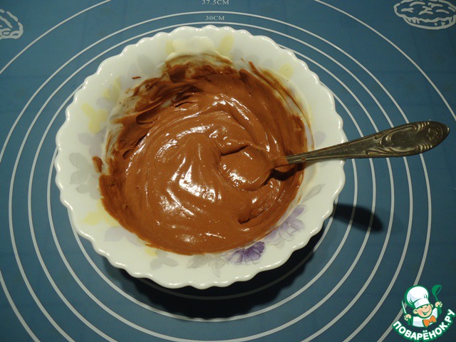 1/2 стакана сырной массы отложить в миску, добавить растопленный в микроволновке темный шоколад, перемешать.