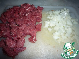 Порезать половинку лука мелко. Мясо небольшими кусочками.