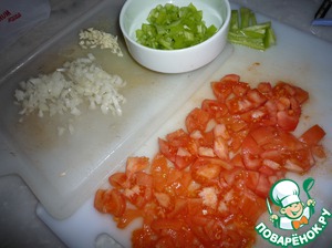 Помидоры, перец мелко нарезать. Несколько ломтиков перца можно оставить. Также мелко режем оставшуюся половинку лука и чеснок.