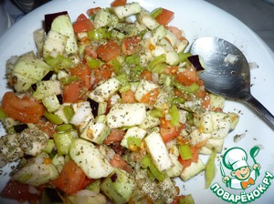 В глубокой миске смешиваем все овощи. Поперчить, посолить, добавить мяту и базилик. Перемешать.