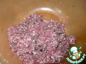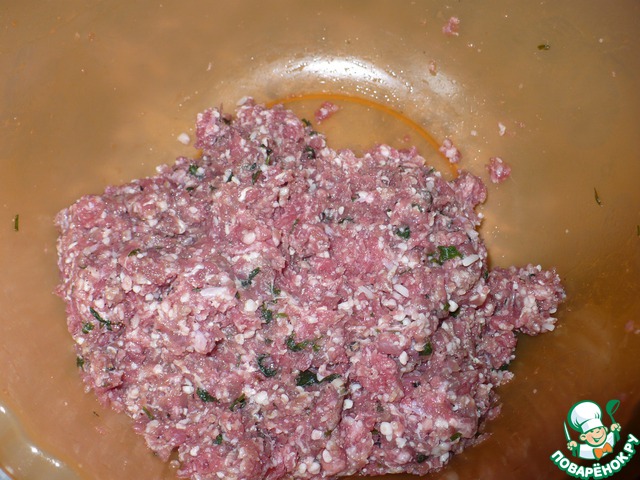Мясо прокручиваем 2 раза, добавляем туда рис, мелко нарубленную кинзу, яйца, солим и перчим по вкусу. -