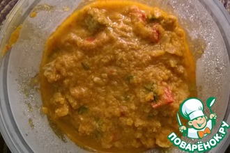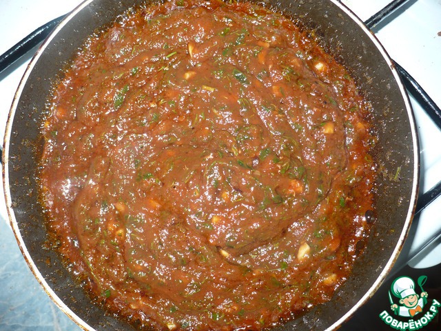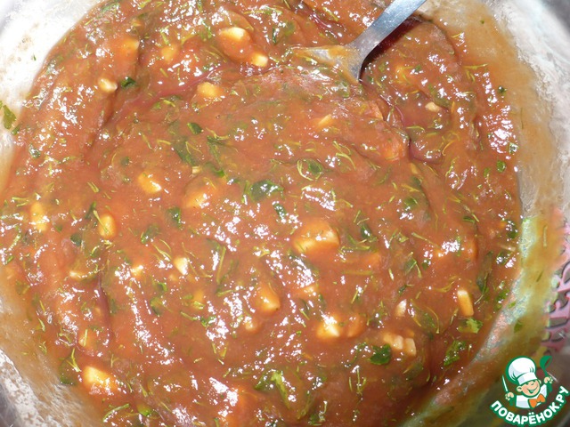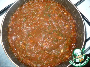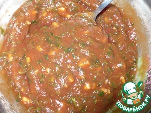 томатную пасту смешиваем с мелко нарубленными зеленью и чесноком, солим и перчим по вкусу. -