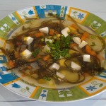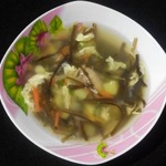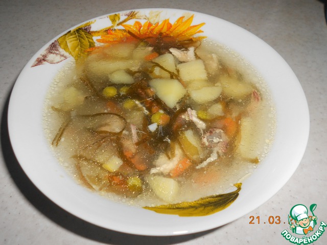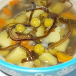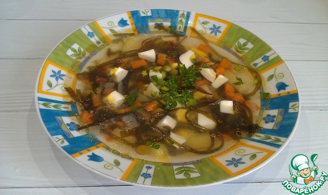 Когда он закипит, кладем мелко нарезанные морковь и лук. Варим 5 мин., добавляем горошек и морскую капусту. В рецепте я написала консервированную, т. к. ее можно купить в магазинах по всей стране, а варила я из своей капусты, мы ее в мае собираем в море, потом сушим и едим всю зиму.