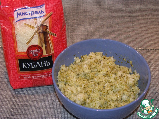 • Отвариваем рис "Кубань" от "Мистраль" в подсоленной воде, даем немного остыть, добавляем 1 ст. ложку соуса песто, хорошо перемешиваем.