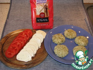 • Руками скатываем шарики из риса и приминаем их с двух сторон. Режем помидоры и моцареллу кружочками.