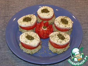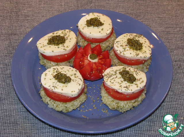 • Выкладываем на рисовые биточки кружочек помидора, кружочек моцареллы, сверху немного соуса песто. Можно посыпать все сушеной смесью итальянских трав или украсить листиками базилика.