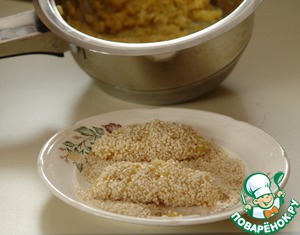 Сформировать небольшие котлетки (или лепешечки) и запанировать в кунжуте.