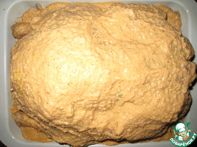 Возвращаем курицу и натираем её соусом. Если у вас получится не повредить кожу, то смажьте под ней. Здесь используем не весь соус, совсем немного.